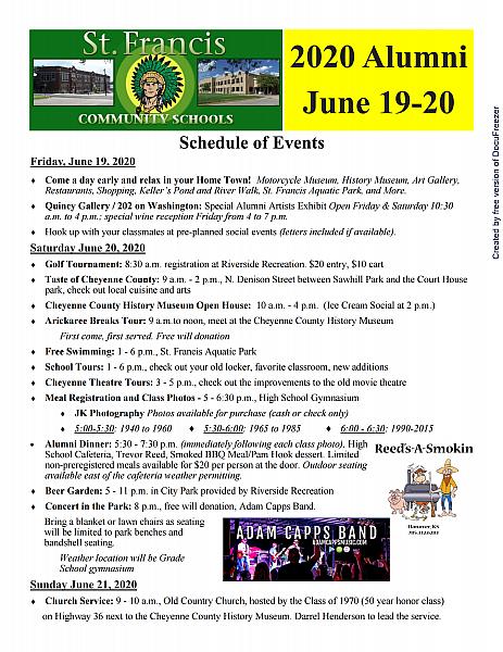 | 9:00am - 10:00am | Alumni Sunday Morning Church Service - Old Country Church, CN County Museum hosted by the Class 1970 (50 year honor class) Darrel Henderson will lead the service 2020 Alumni Reunion Facebook Page | ||