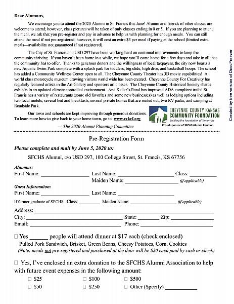 | 5:30pm - 7:30pm | Alumni Dinner - High School Cafeteria Staggered immediately following each honor class group photo Trevor Reed, 2008 SFHS Alum, Smoked BBQ Meal/ Pam Hook dessert. Limited non-preregistered meals available for $20 per person at the door. (Outdoor dining available east of cafeteria weather permitting) 2020 Alumni Reunion Facebook Page | ||