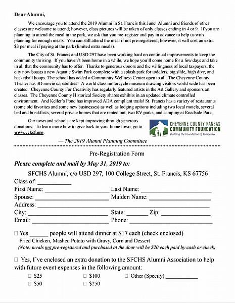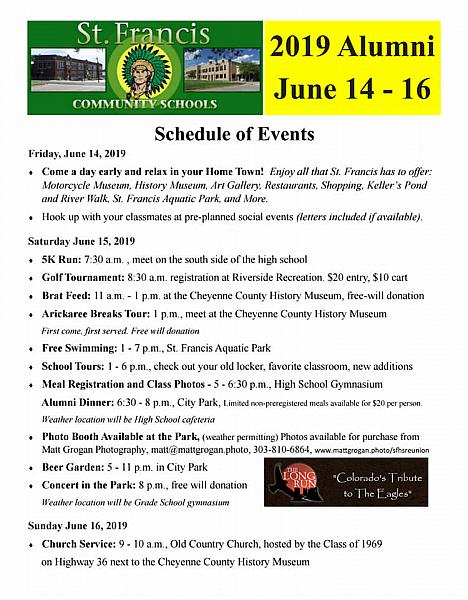 | 1:00pm - 6:00pm | School Tours Tour your school, find your old locker, classrooms, check out the new additions. Make a tax deductible donation to the USD 297 Educational Fund in the Cheyenne county KS Community Foundation to support your alma mater. St. Francis High School Facebook page | ||